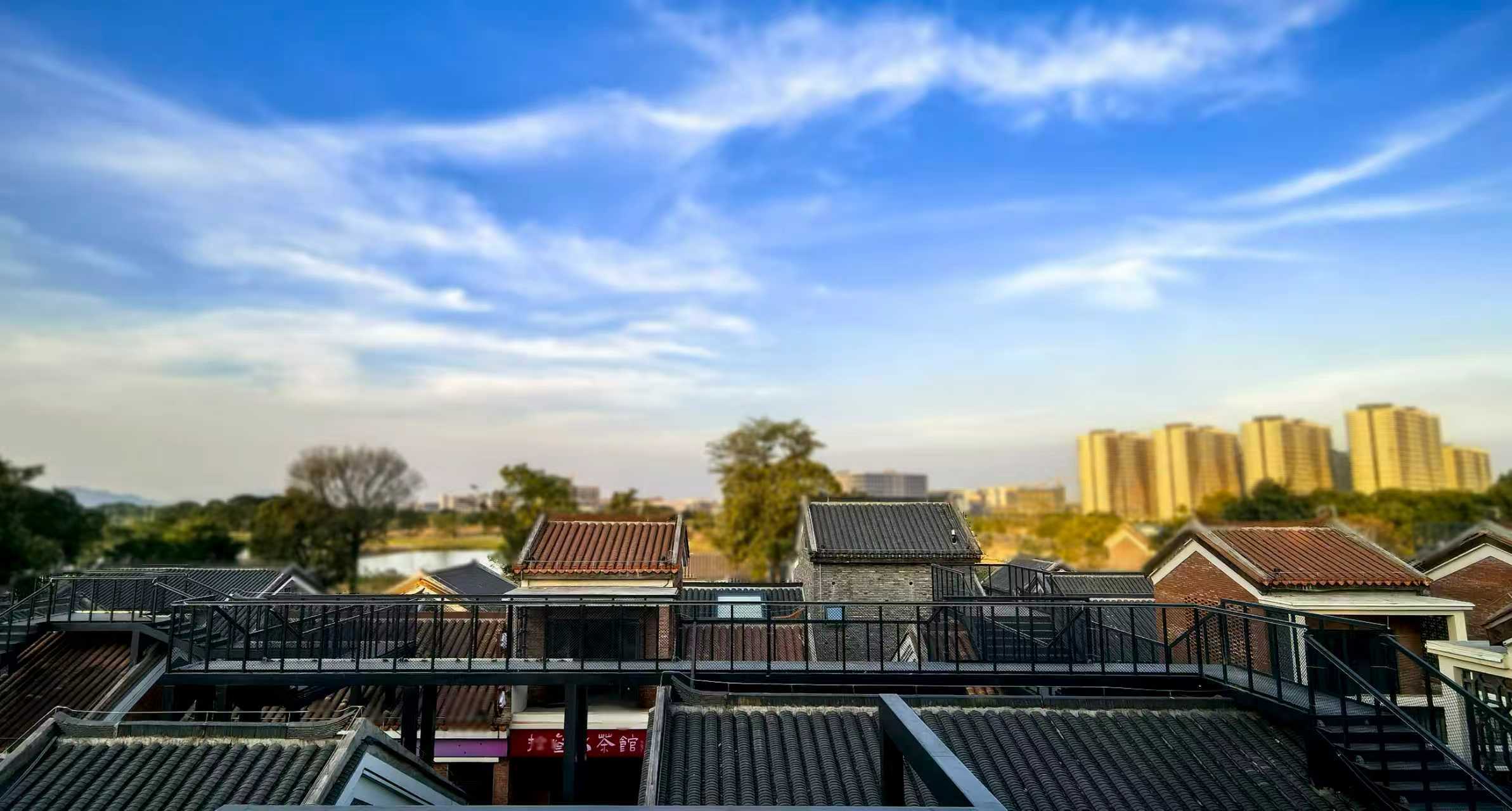 项目的一大亮点是独具特色的屋顶观景廊道。登上屋顶廊道,整个五福村美景尽收眼底——或青色或红色的墙面,与客家特色飞檐翘角交相辉映,一条廊道正好位于一棵苍劲的古树下。